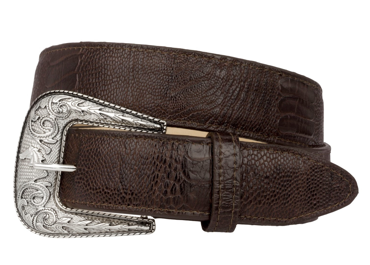 Brown Western Cowboy Belt Ostrich Leg Print Leather - Silver Buckle