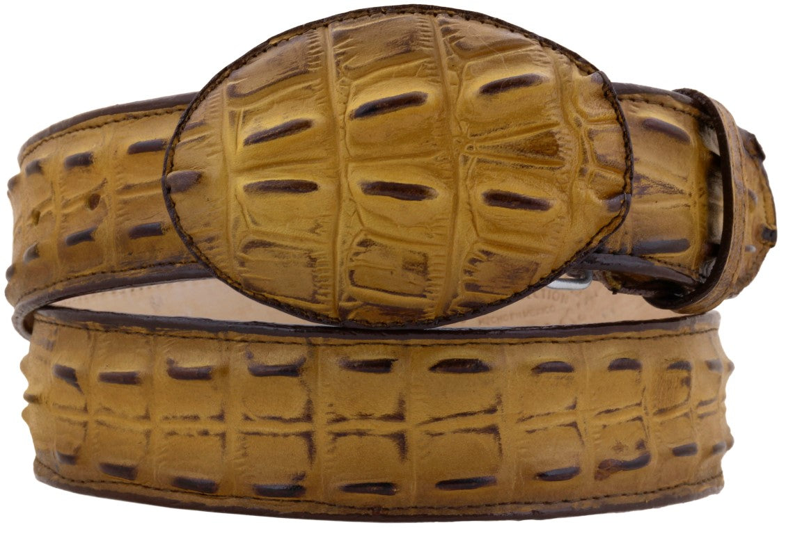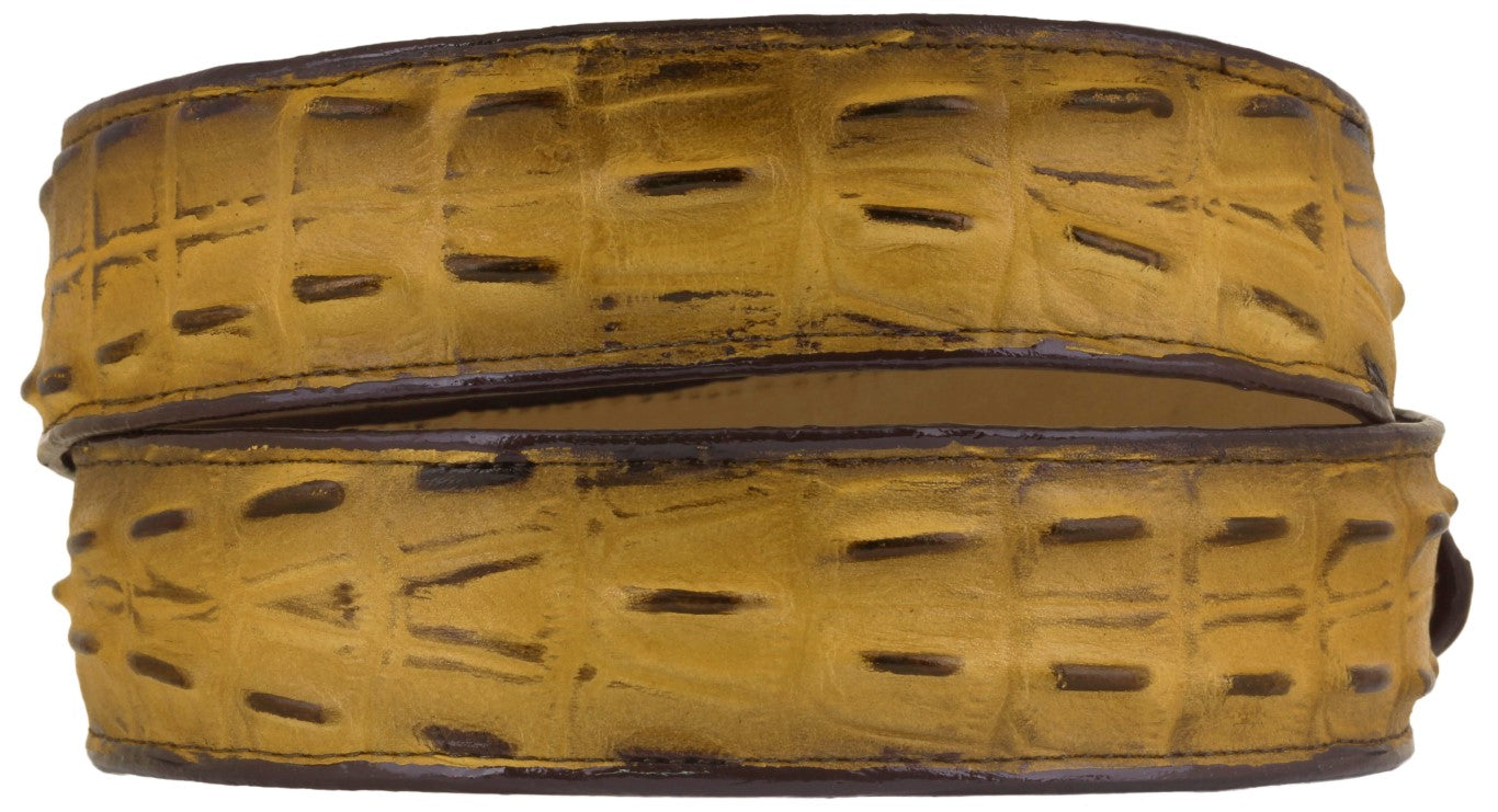 Rustic Yellow Western Belt Crocodile Tail Print Leather - Rodeo Buckle