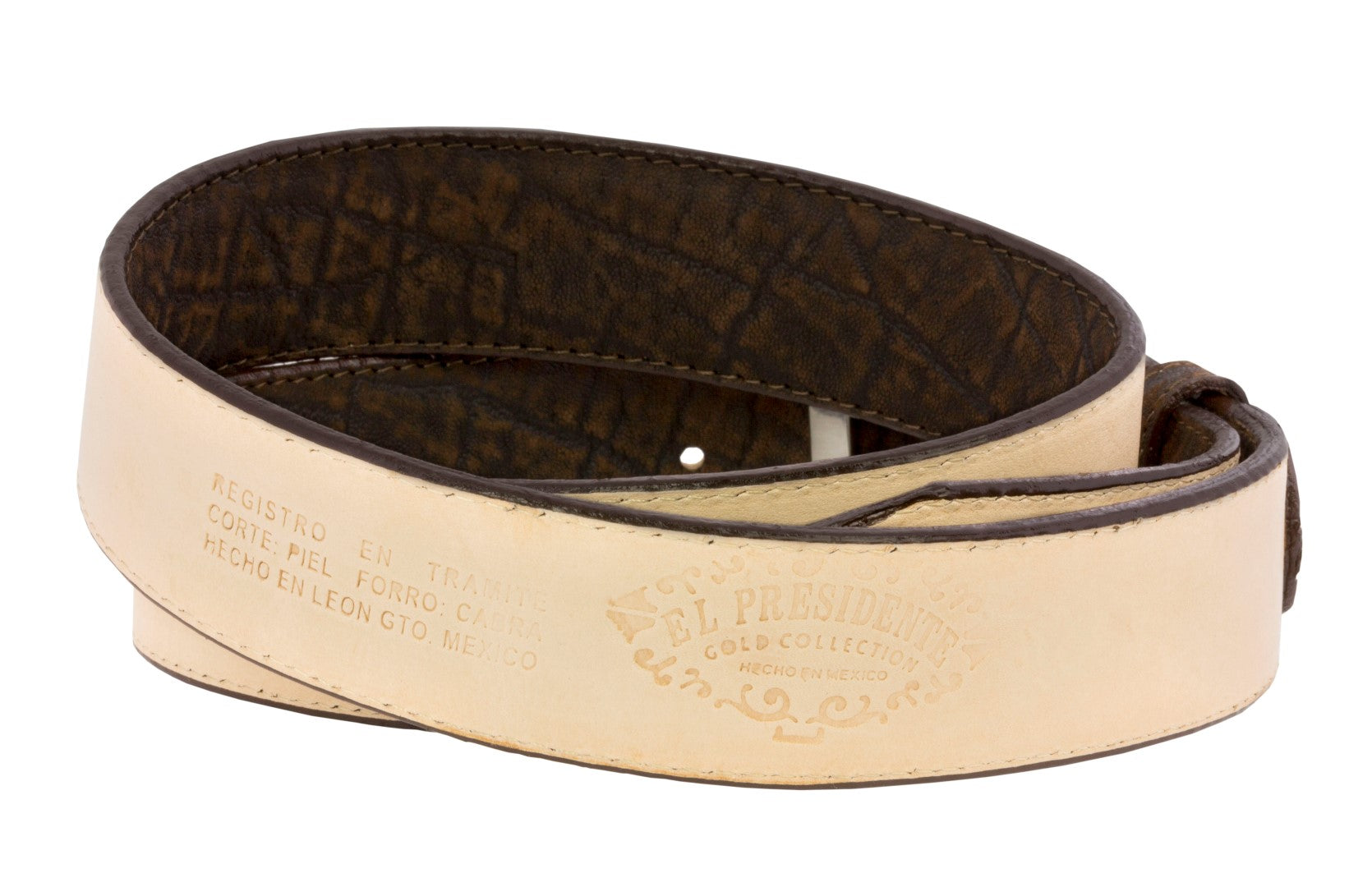 - Description: El Presidente's handmade genuine leather belt has become a true essential to every man's wardrobe over the years. This belt features a stylish pattern; a perfect match for any man seeking a luxurious style belt. Handmade in Leon Mexico. You can pair this belt with fine leather Oxfords Shoes, Chelsea Boots, and Western Cowboy Boots. Purchase a durable and versatile belt. Our belts features a removable buckle for your own customization. Simply remove the 2 screws add your buckle and then fasten the buckle.