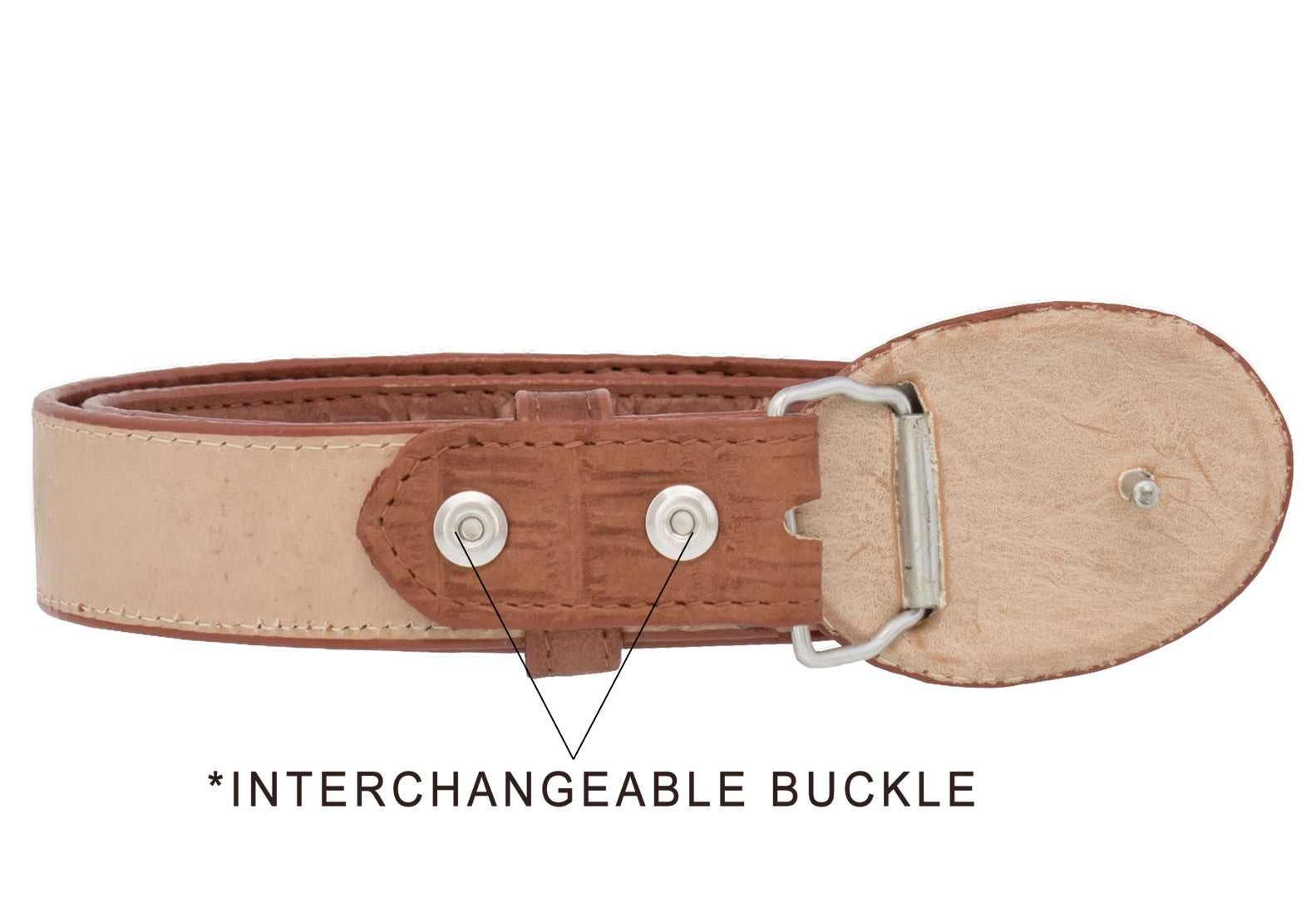 - Description: This is a handcrafted in Leon, Guanajuato, Mexico. Along with an elegant animal finish, this belt is a must have for any collection. You can pair this belt with fine leather Oxfords Shoes, Chelsea Boots, and Western Cowboy Boots. Purchase a durable and versatile belt. Our belts features a removable buckle for your own customization. Simply remove the 2 screws add your buckle and then fasten the buckle.