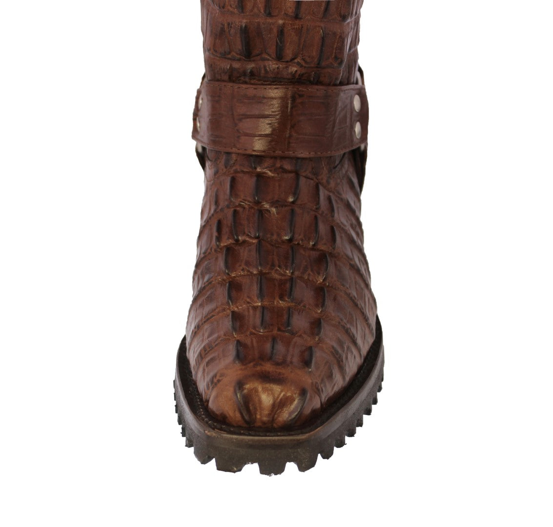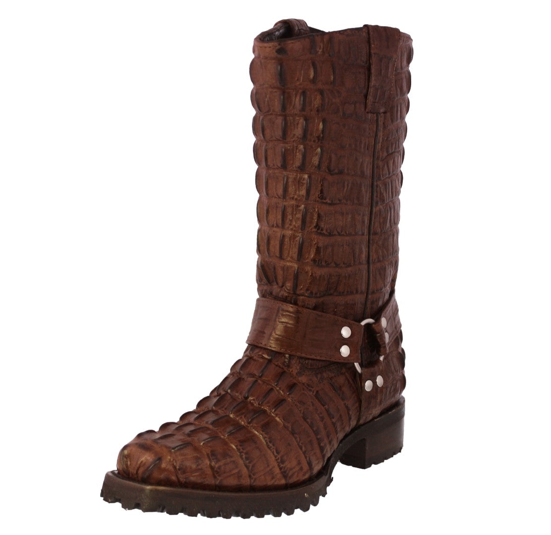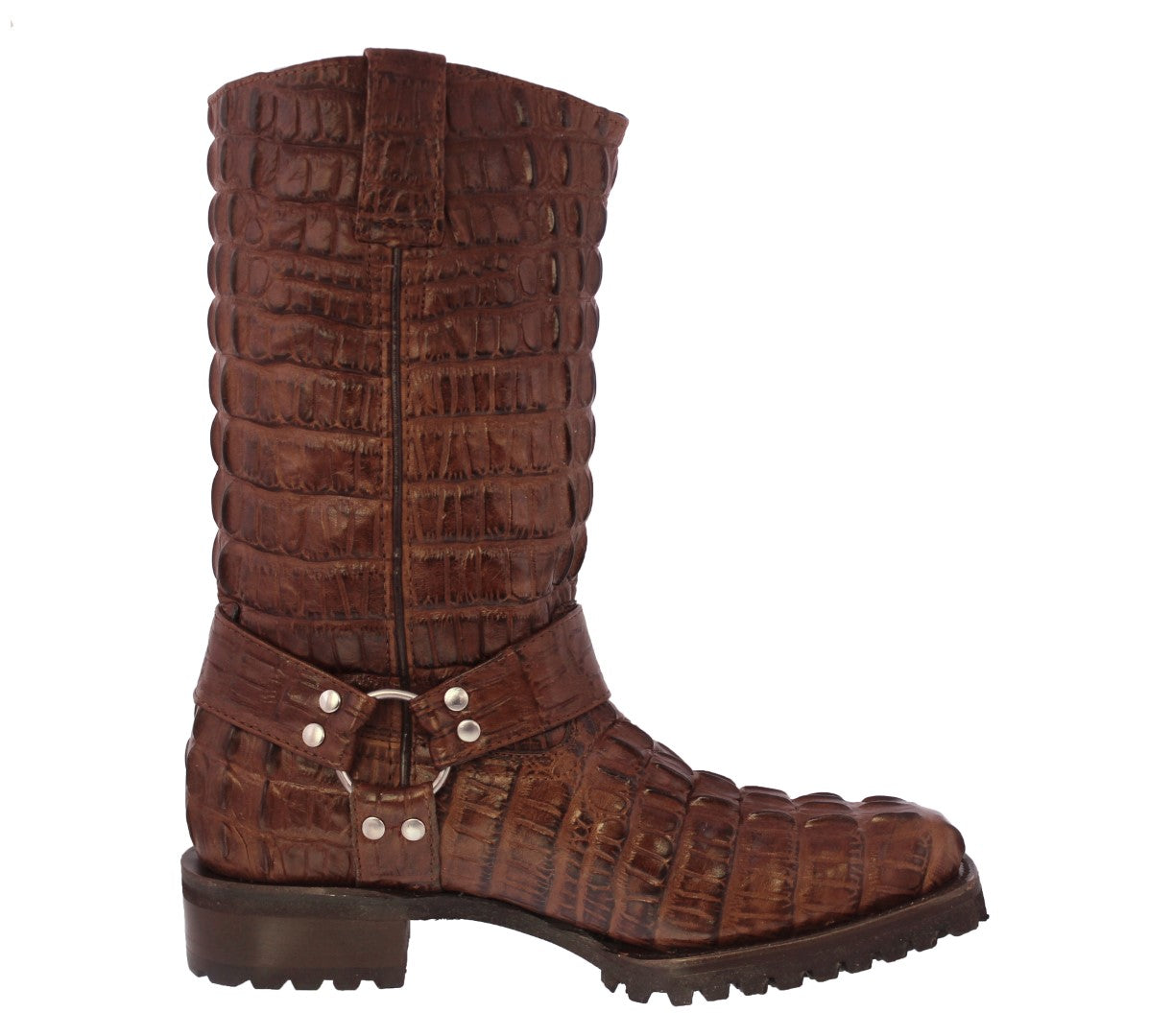 Mens Brown Motorcycle Boots Crocodile Tail Print - Square Toe
