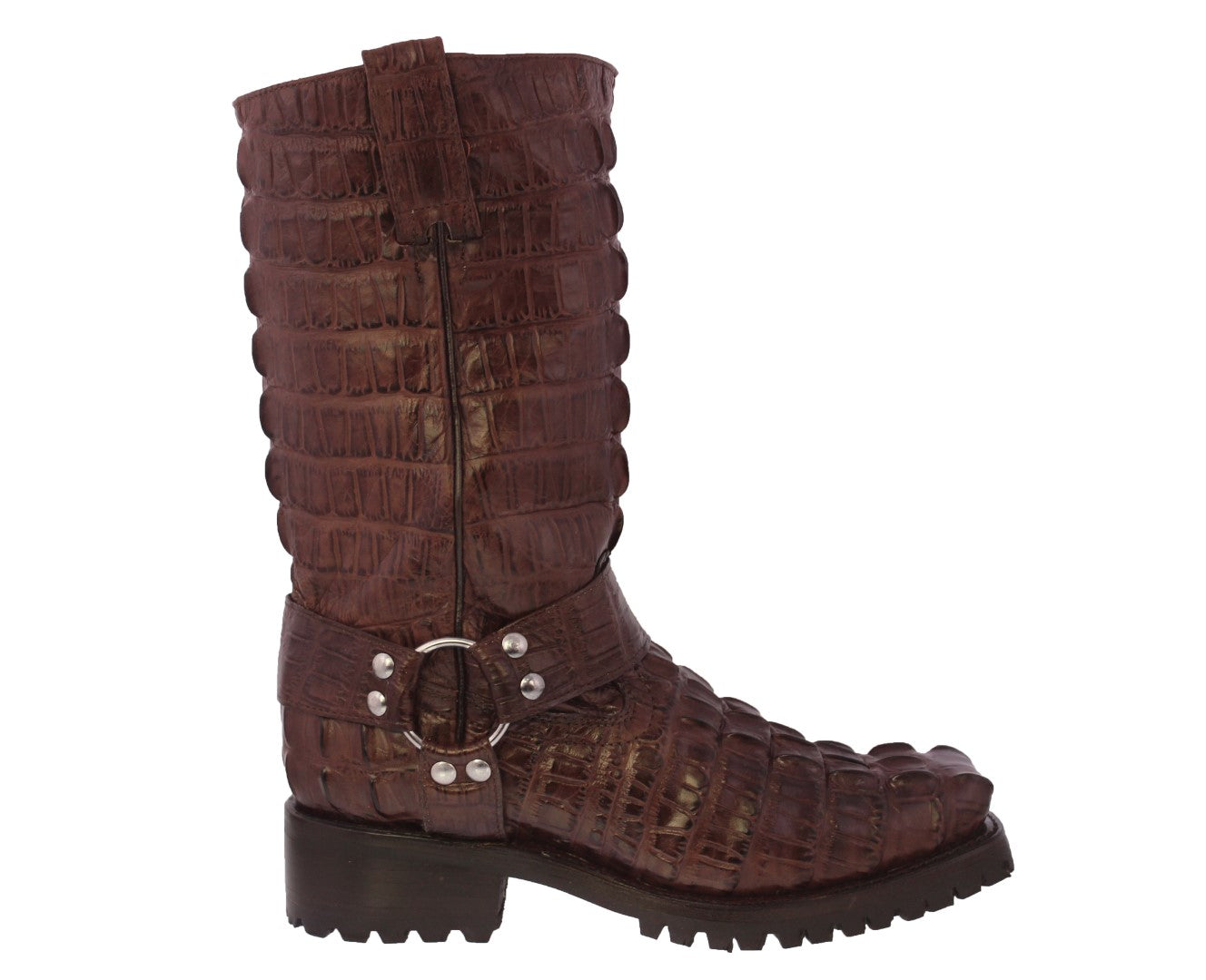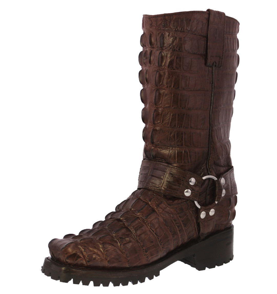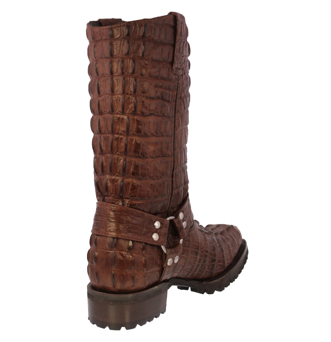 Mens Brown Motorcycle Boots Crocodile Tail Print - Square Toe