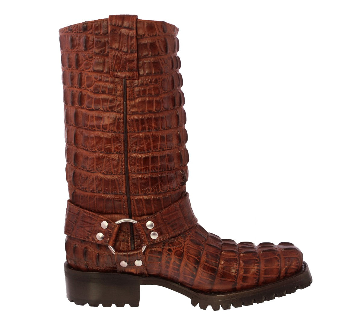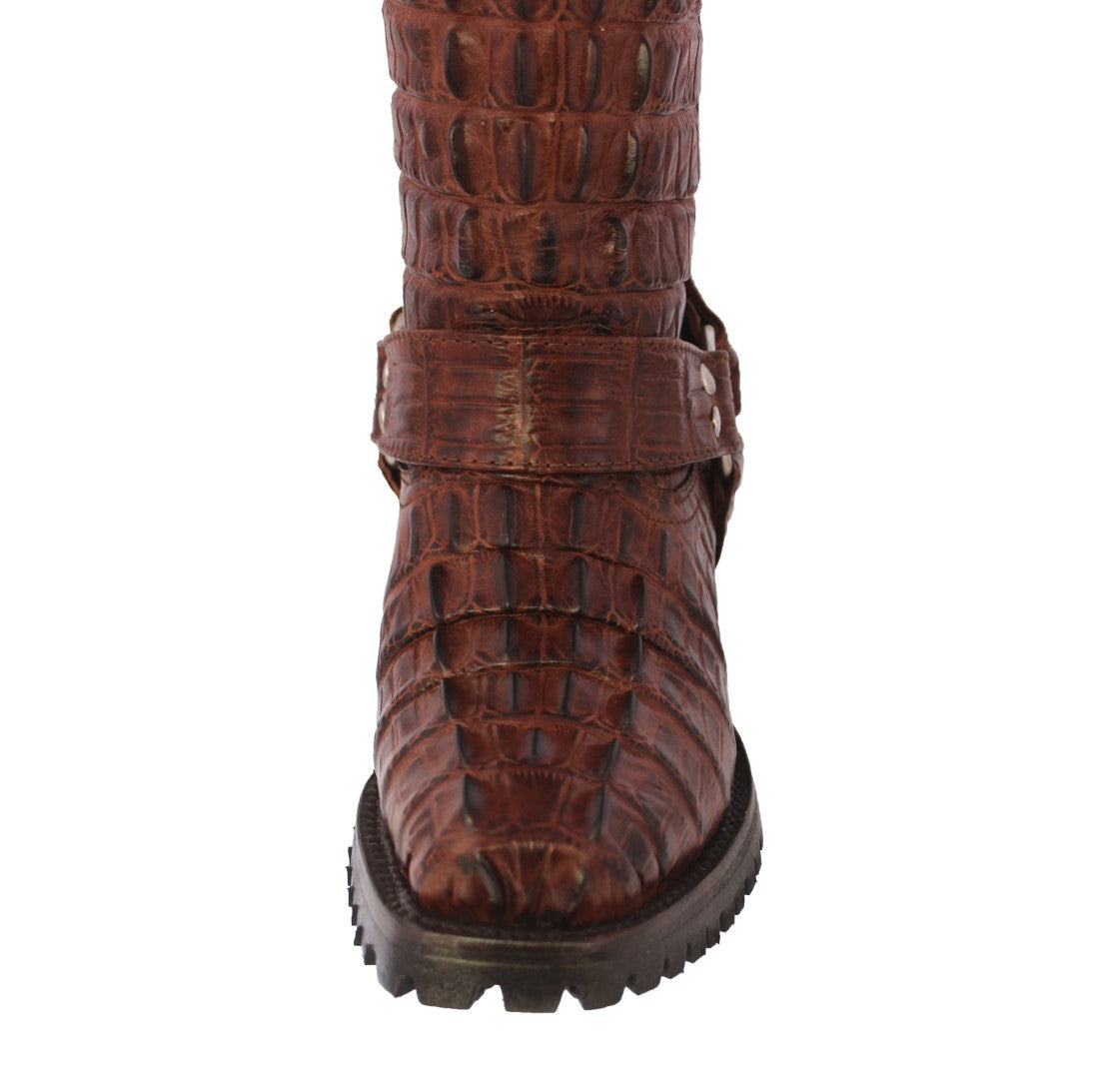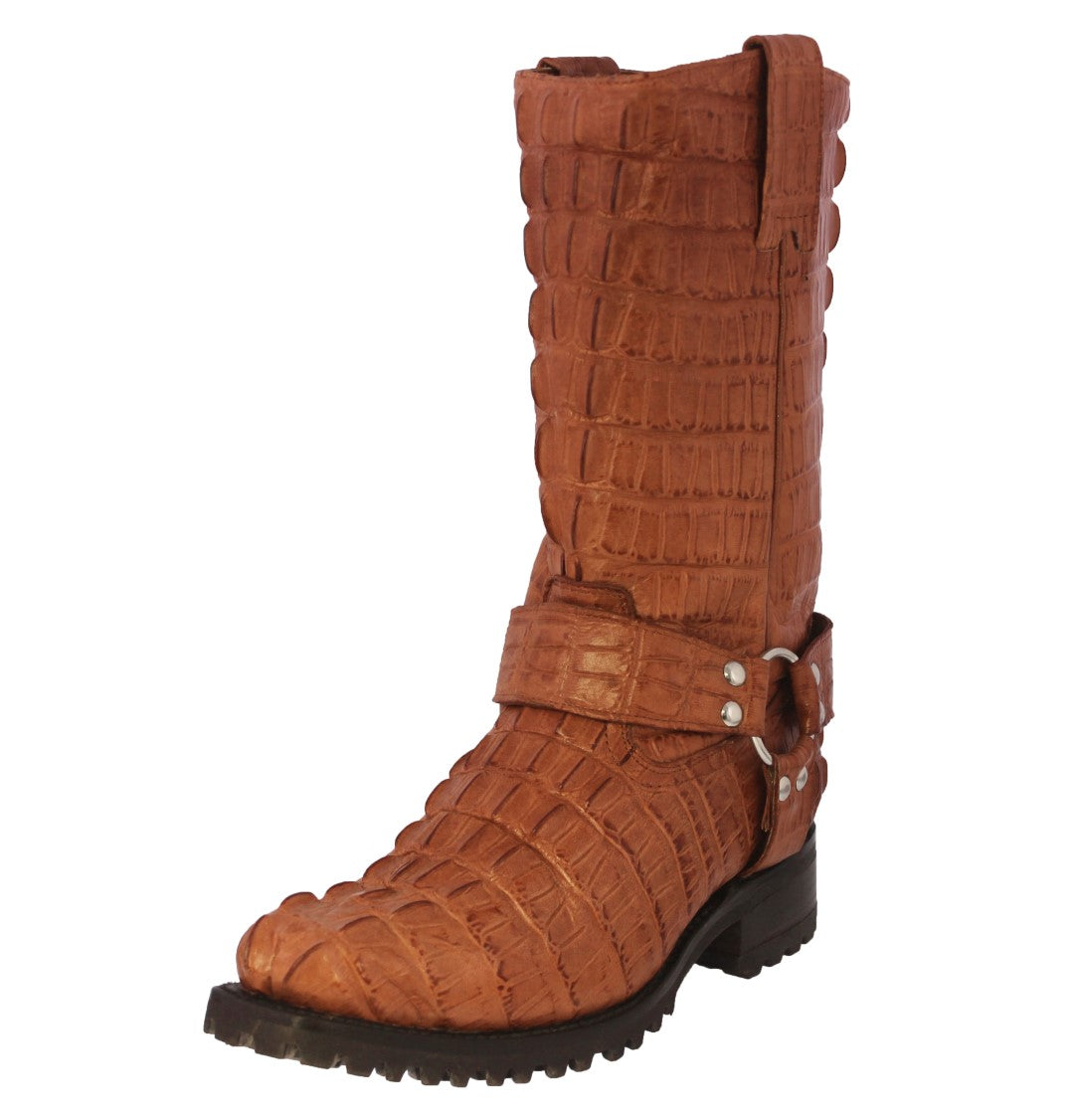 Mens Cognac Motorcycle Boots Crocodile Tail Print - Square Toe