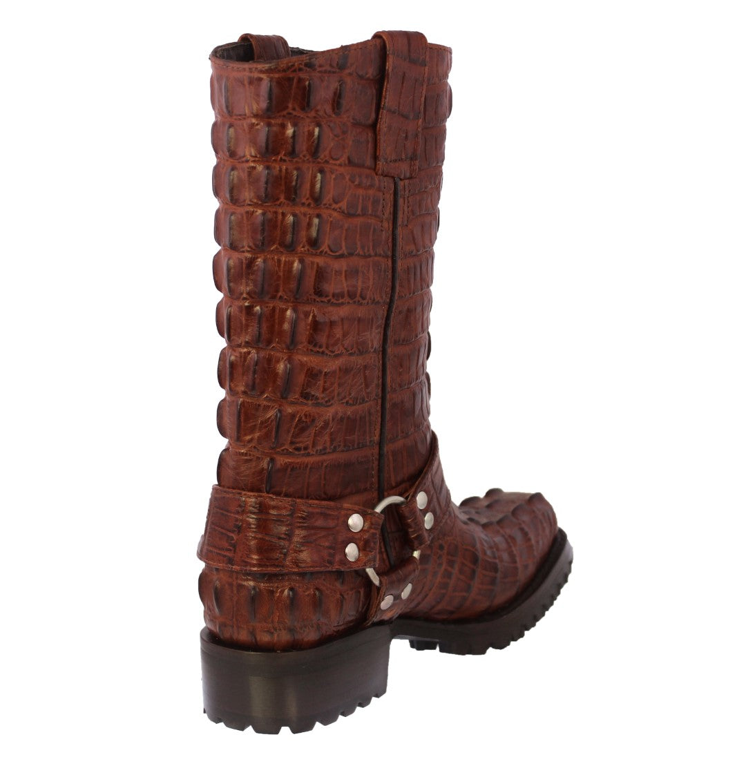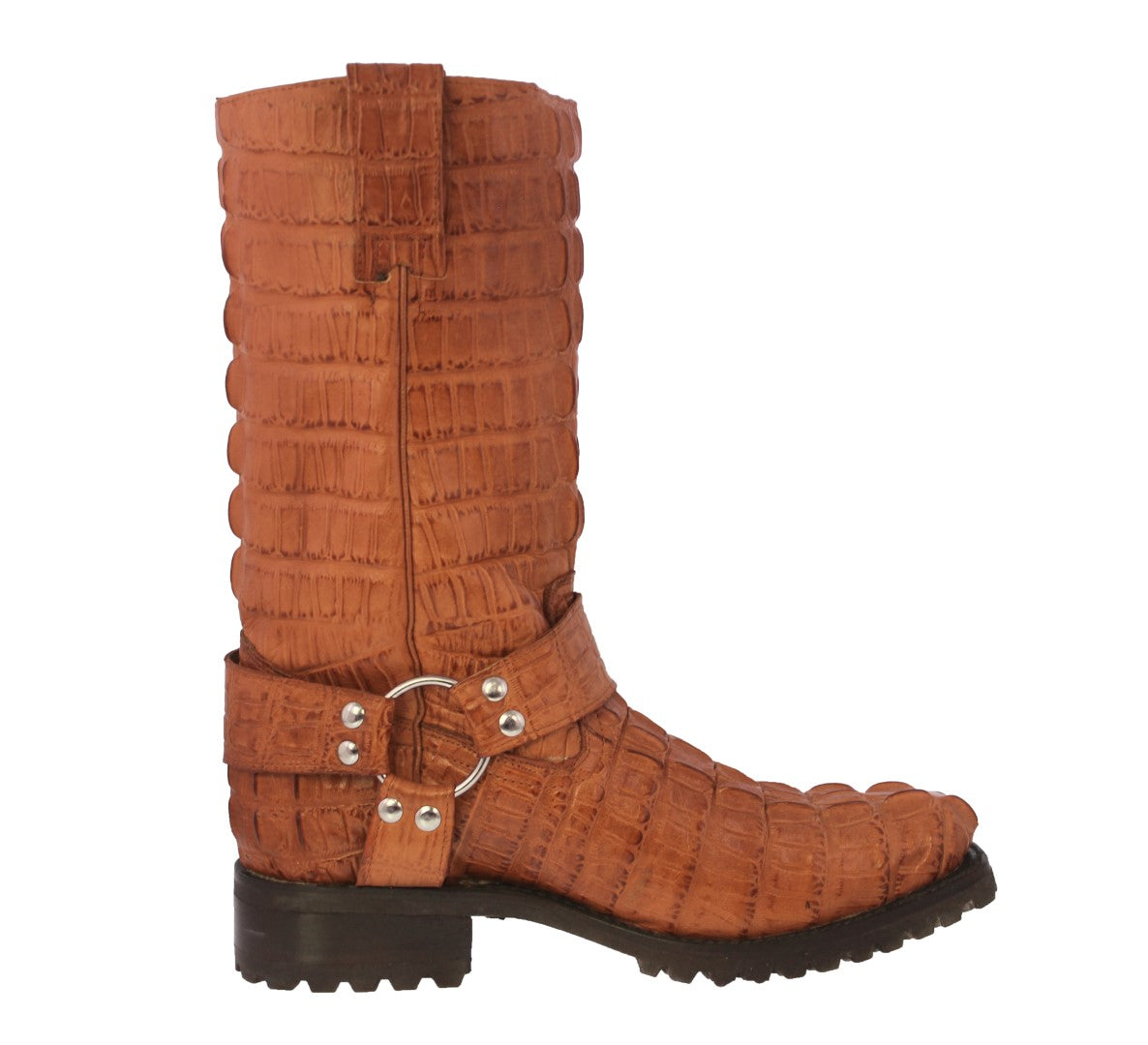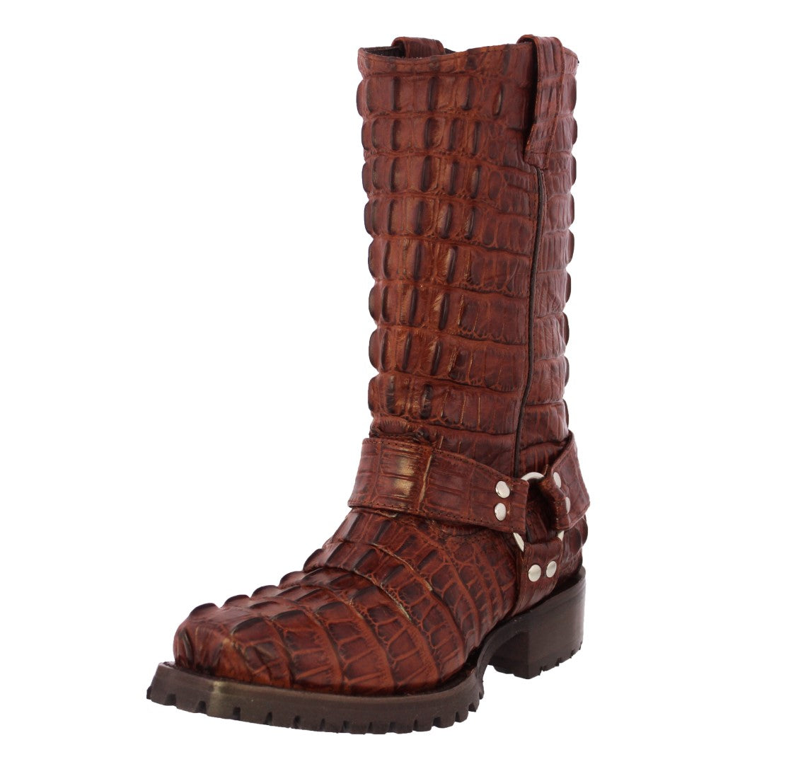 Mens Cognac Motorcycle Boots Crocodile Tail Print - Square Toe