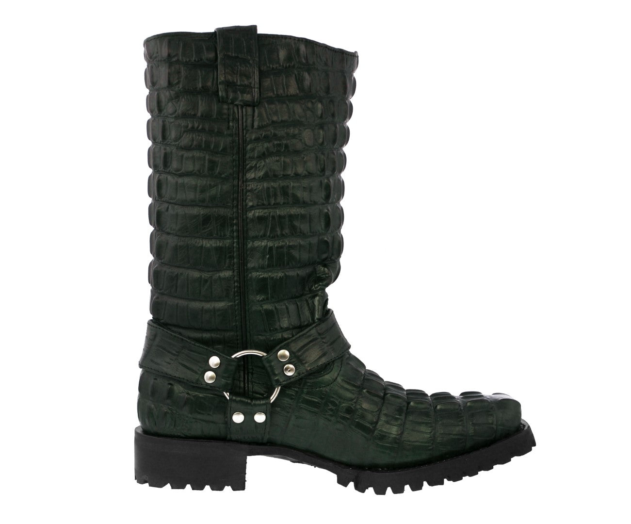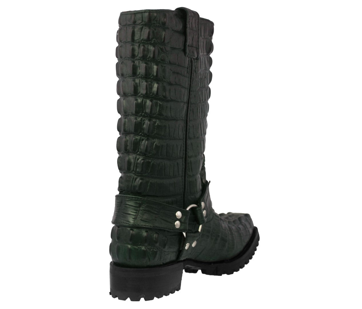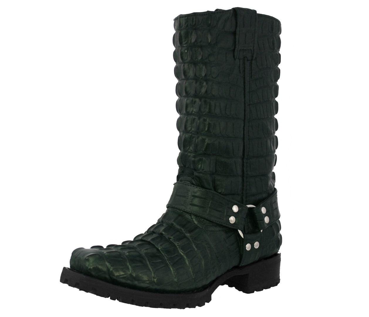 Mens Green Motorcycle Boots Crocodile Tail Print - Square Toe