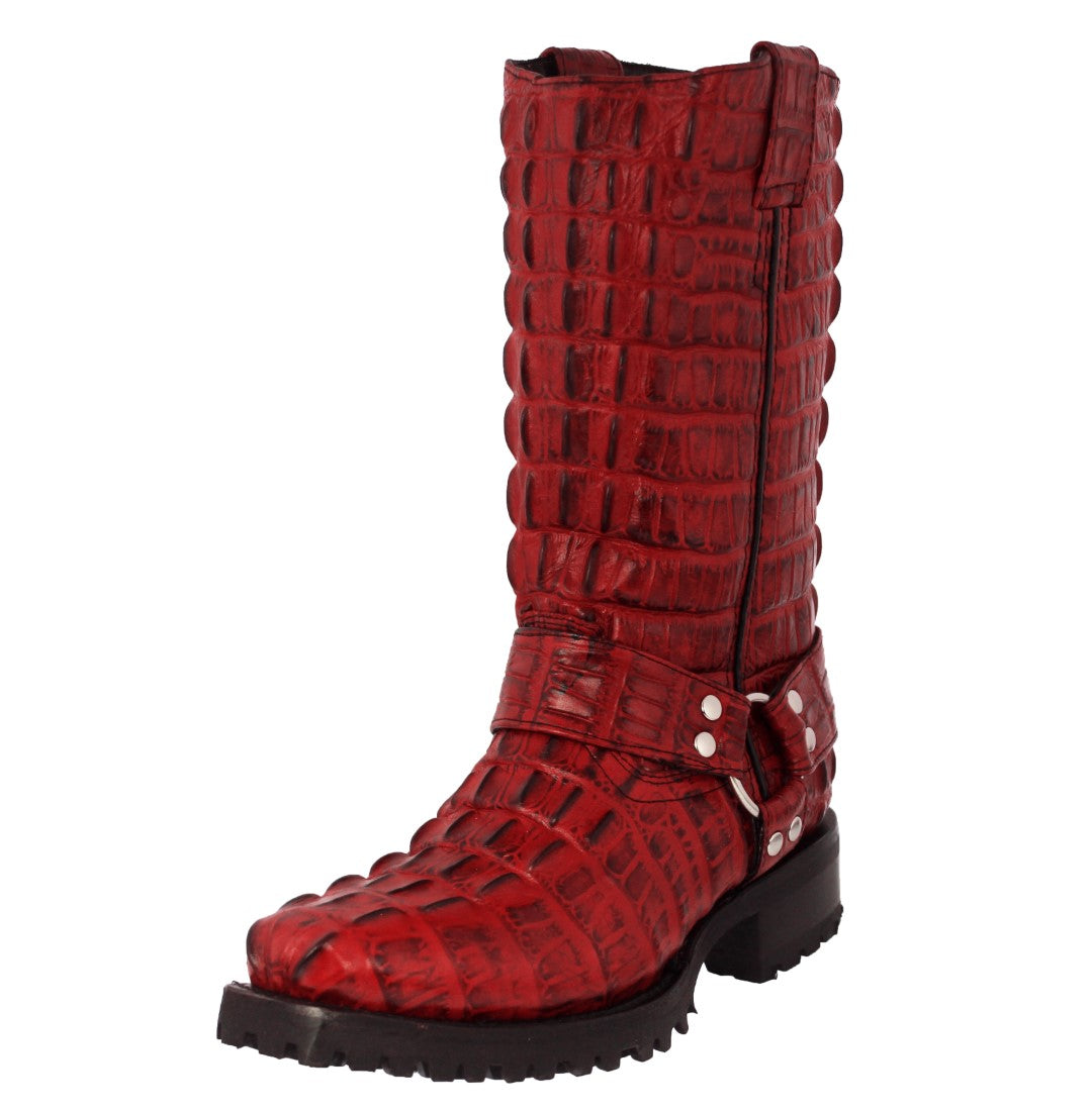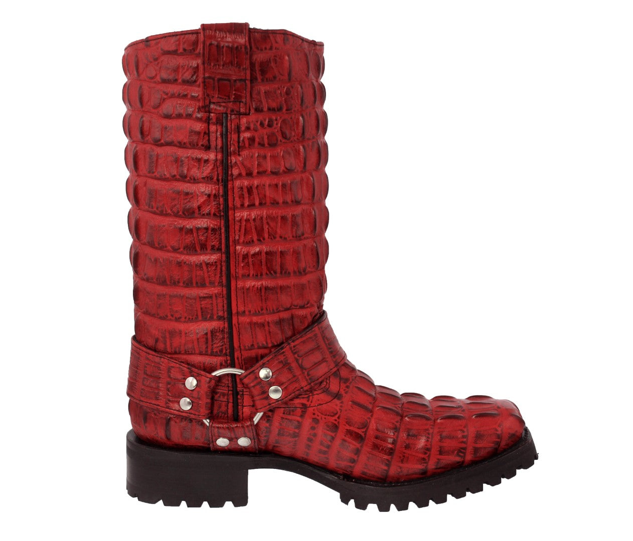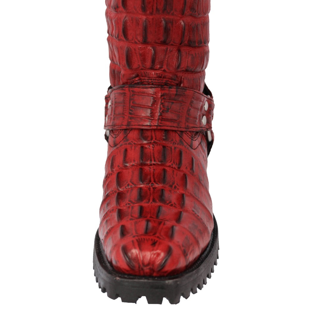 Mens Red Motorcycle Boots Crocodile Tail Print - Square Toe