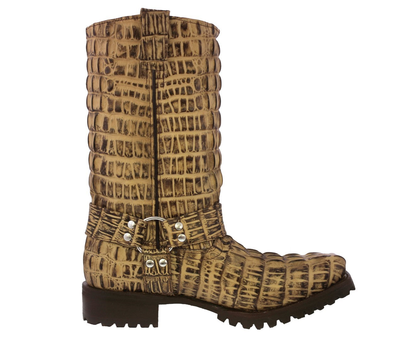 Mens Rustic Sand Motorcycle Boots Crocodile Tail Print - Square Toe