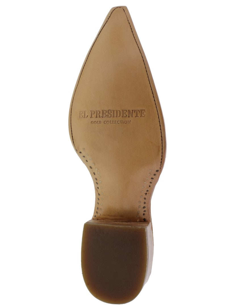• Description: Introducing the El Presidente / Cowboy Professional Real Exotic Skin Collection, a hand crafted Western Cowboy Boot built for comfort and durability. Along with an elegant embroidered finish, this boot is a must have boot for any collection. This boot is handcrafted in Leon, Guanajuato, Mexico by some of the most experienced boot makers in the country. These boots feature genuine leather shafts & uppers (vamps), welt stitched full leather soles that are reinforced with wood pegs and solid brass nails for durability. Stacked leather heels and full leather linings.