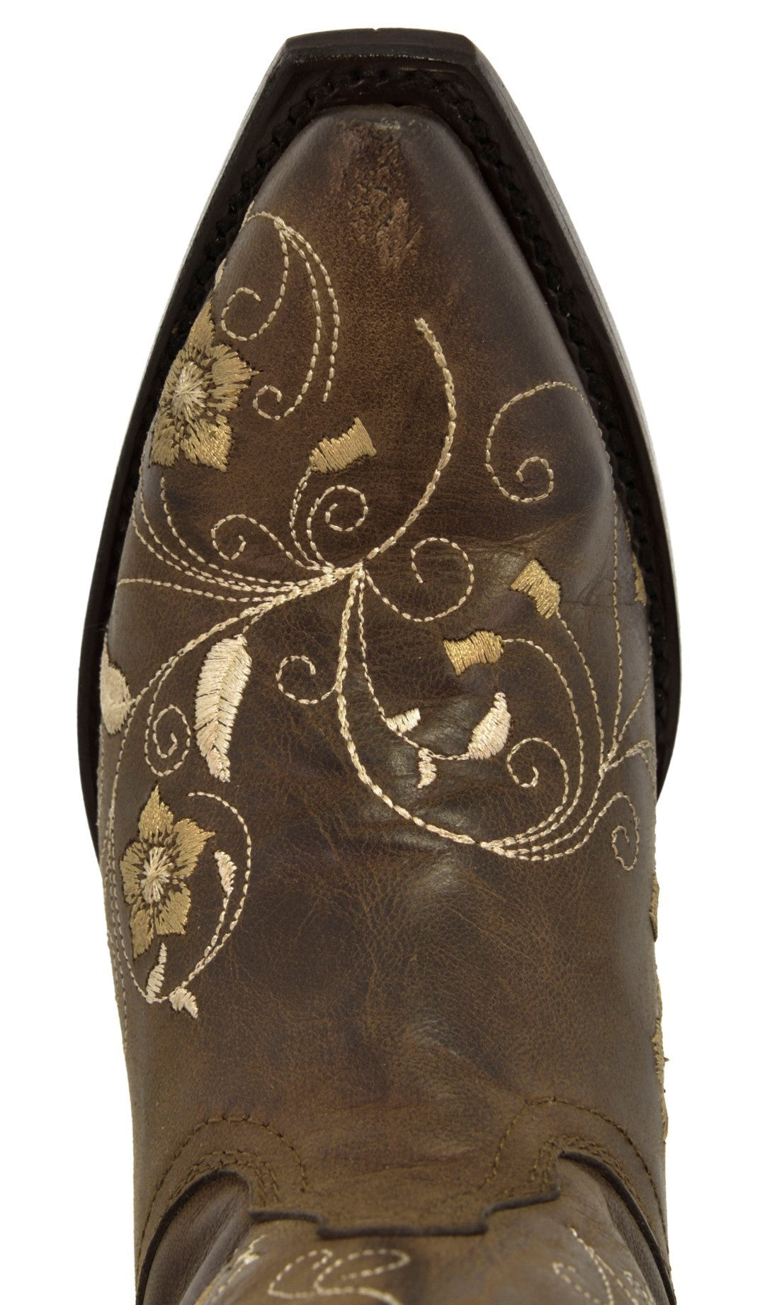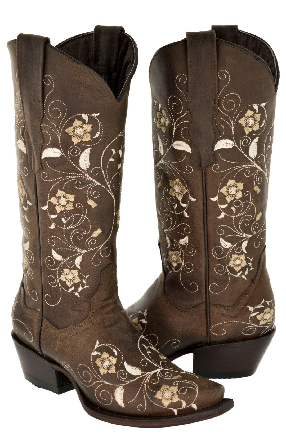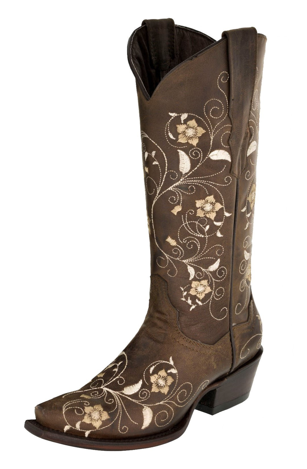 Womens Sofia Brown Leather Cowboy Boots Floral - Snip Toe