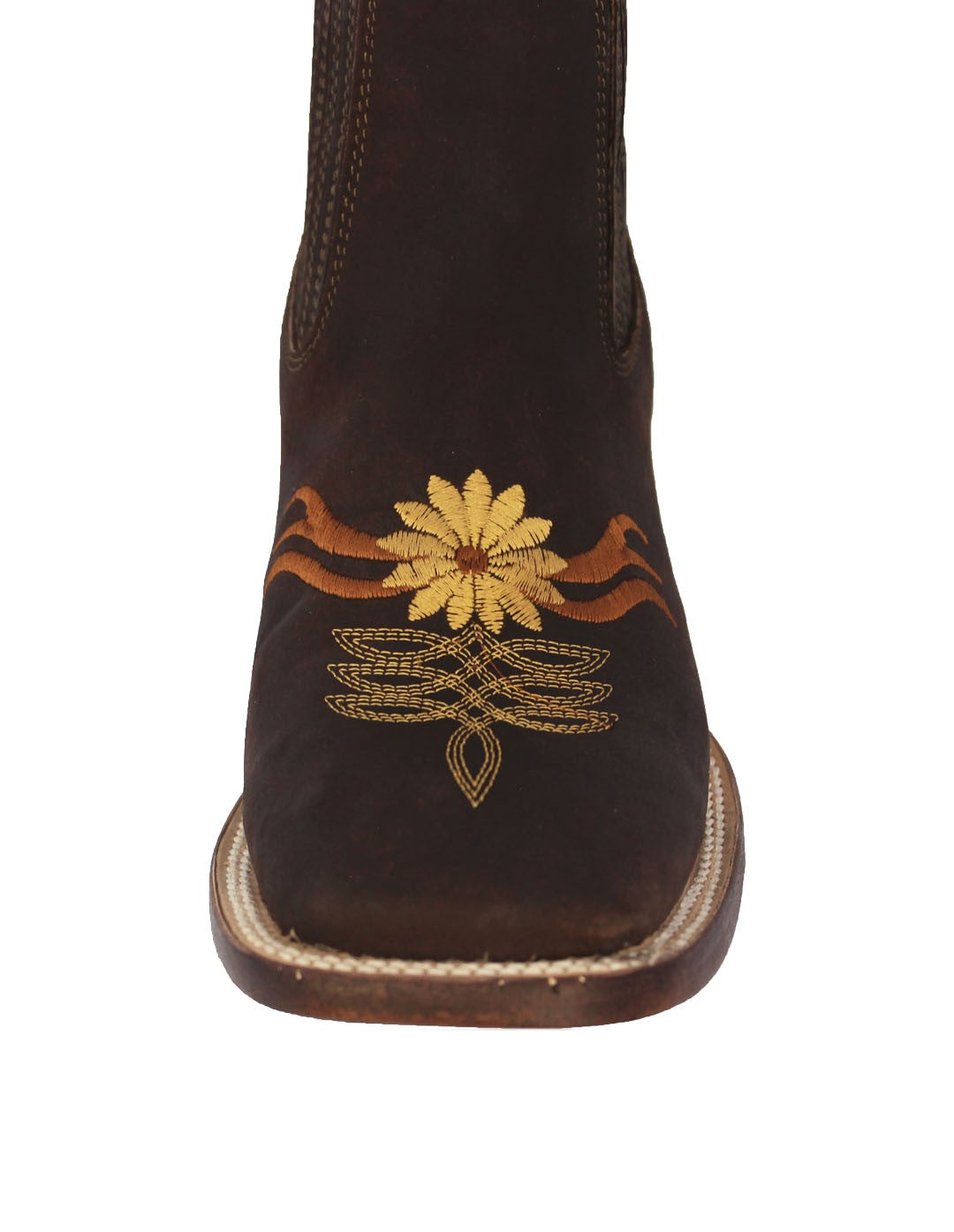 Womens Brown Chelsea Leather Floral Ankle Boots - Square Toe
