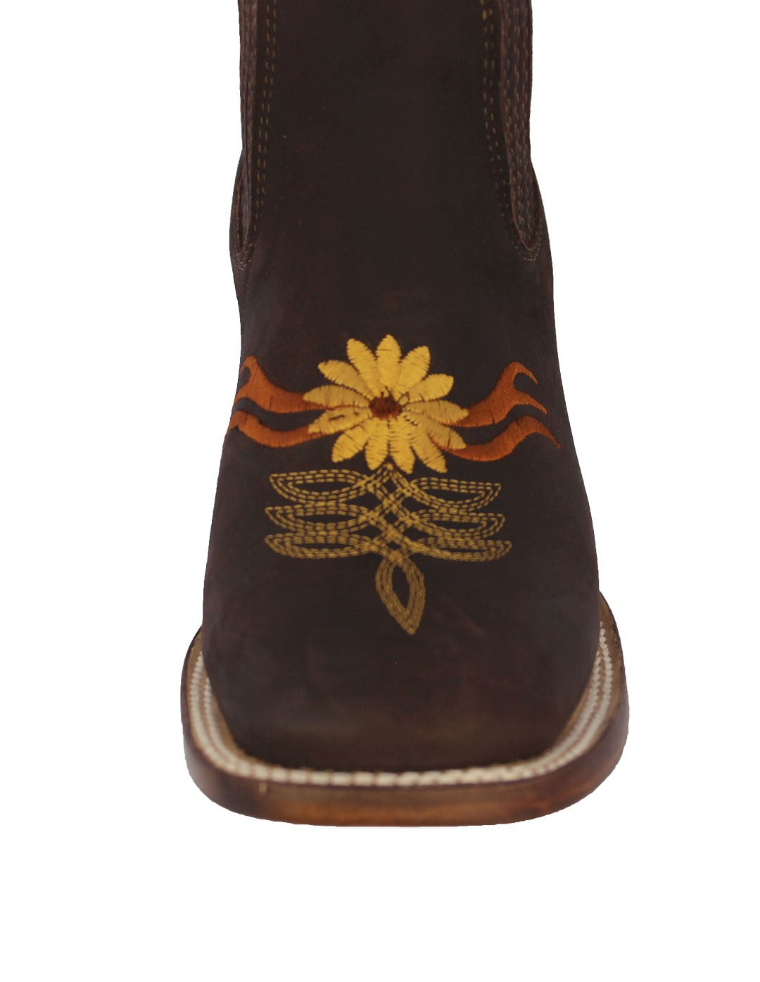 Womens Dark Brown Chelsea Leather Floral Ankle Boots - Square Toe