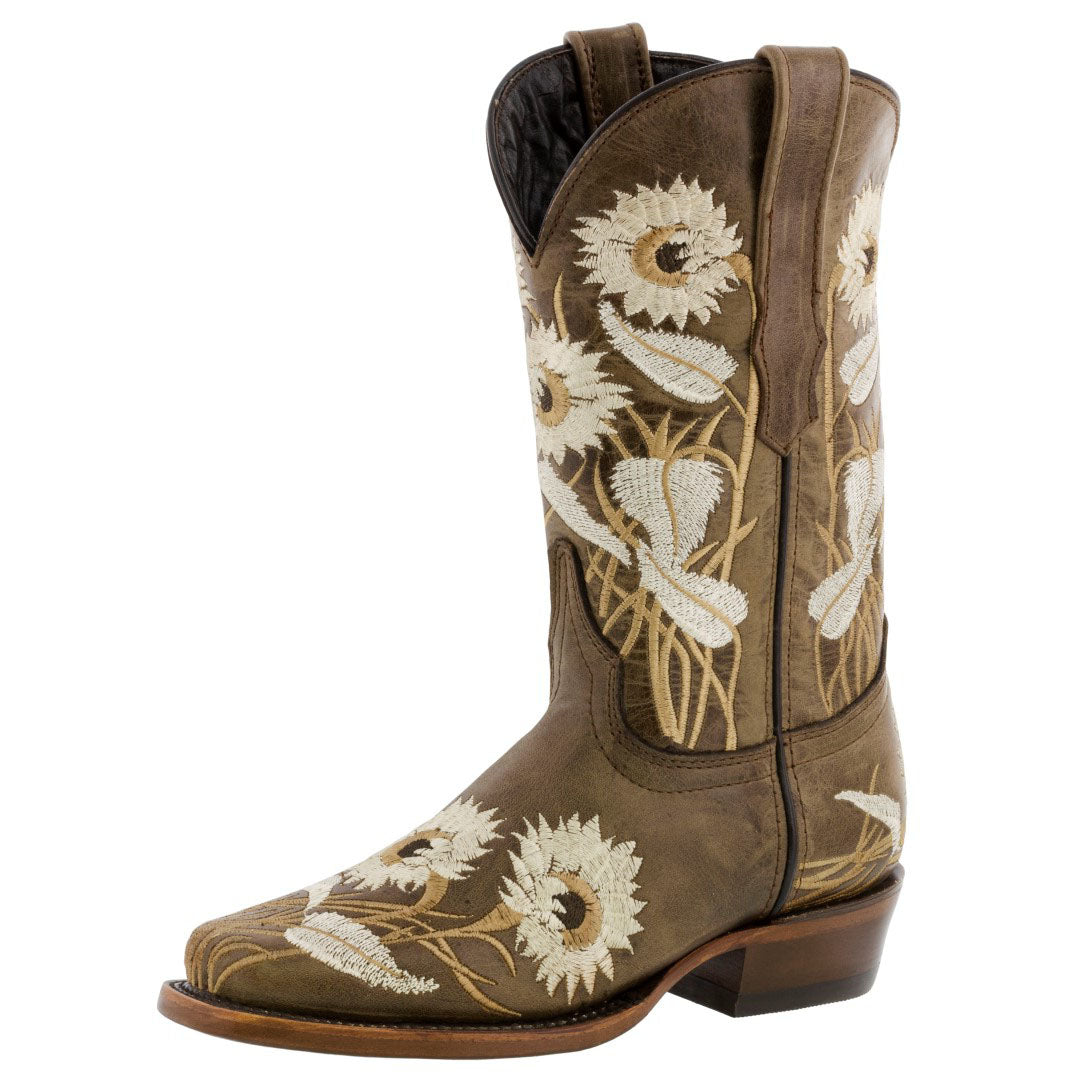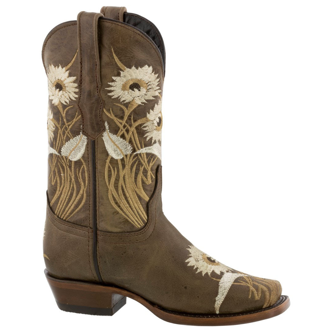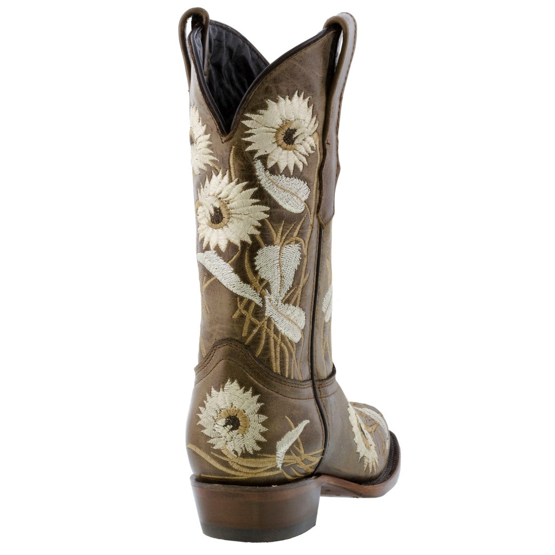 Womens Light Brown Western Boots Sunflower Embroidered Leather - Square Toe