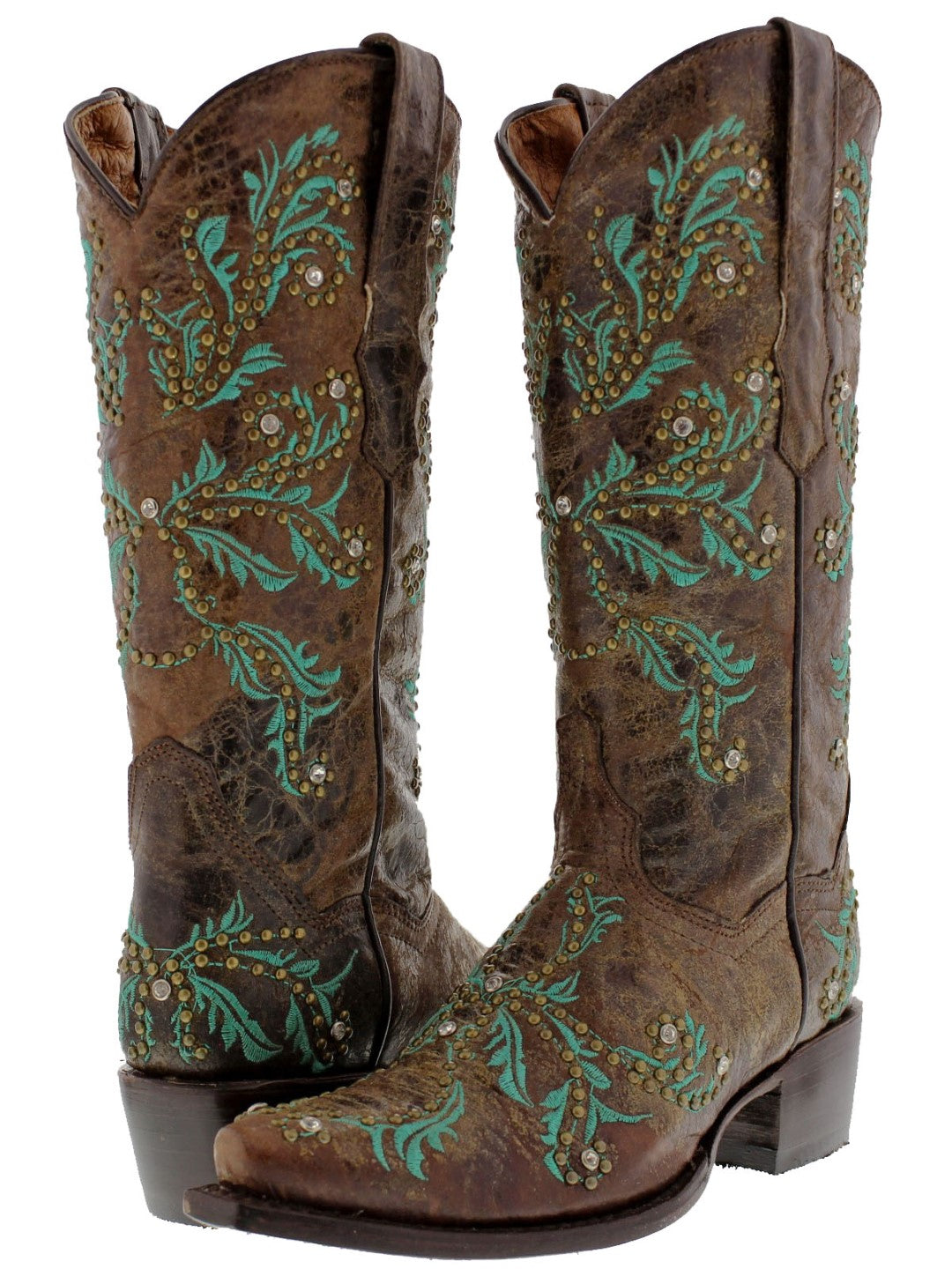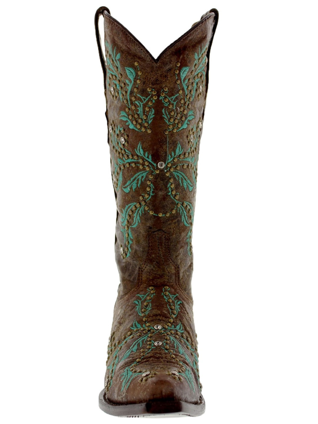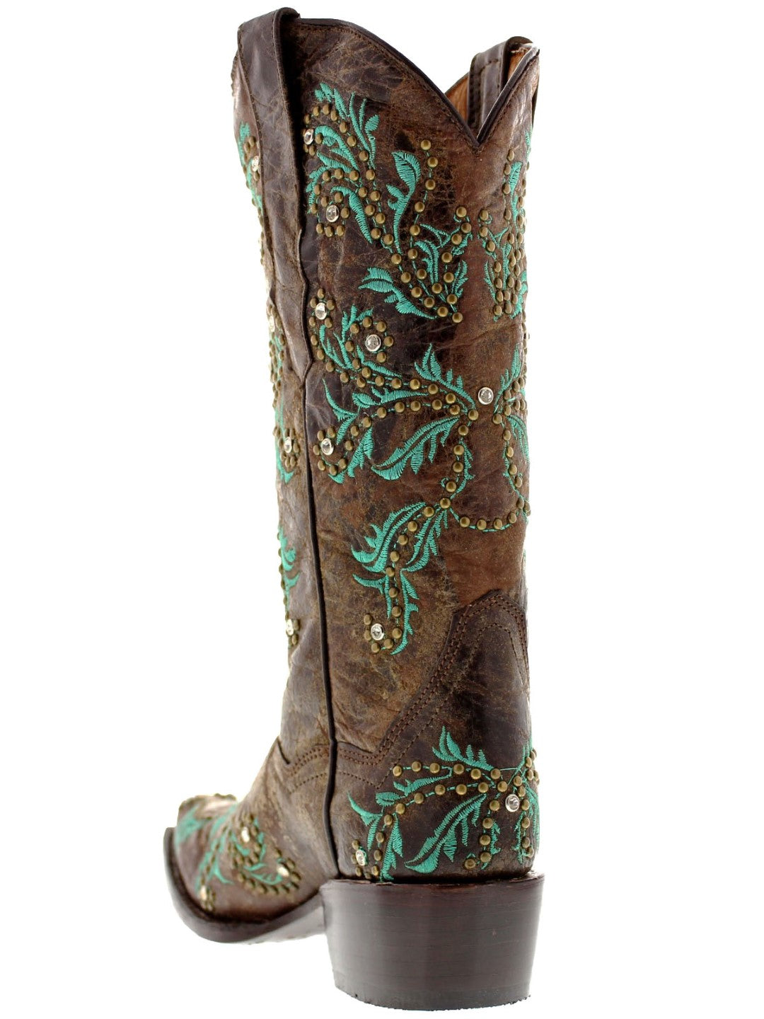 Womens Malaga Brown Leather Cowboy Boots Embroidered - Snip Toe