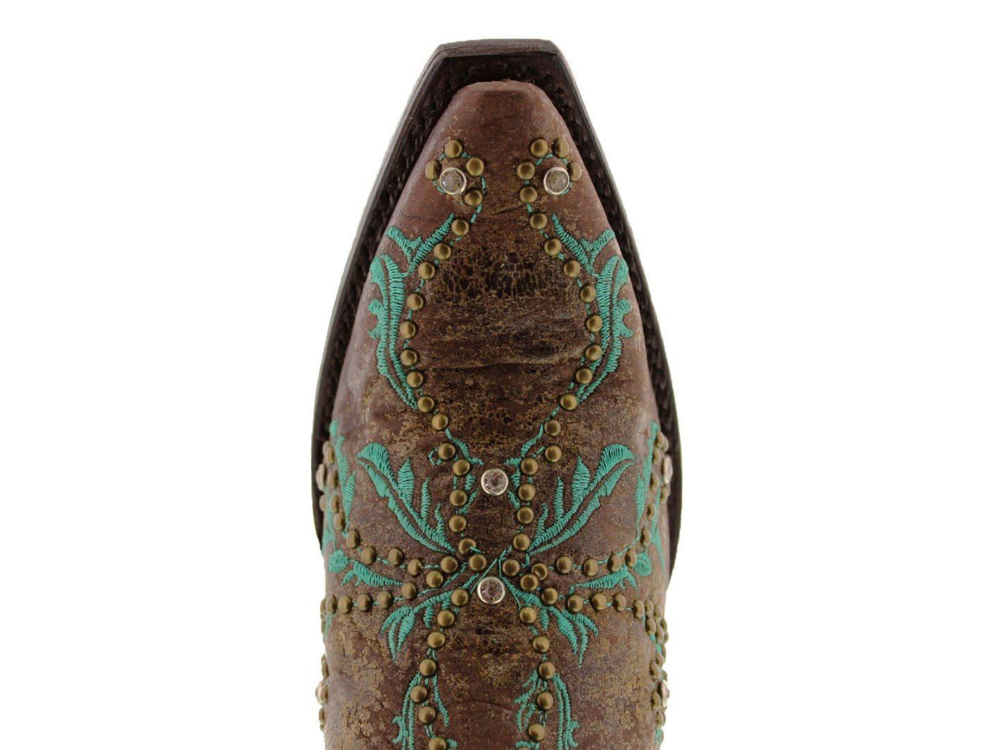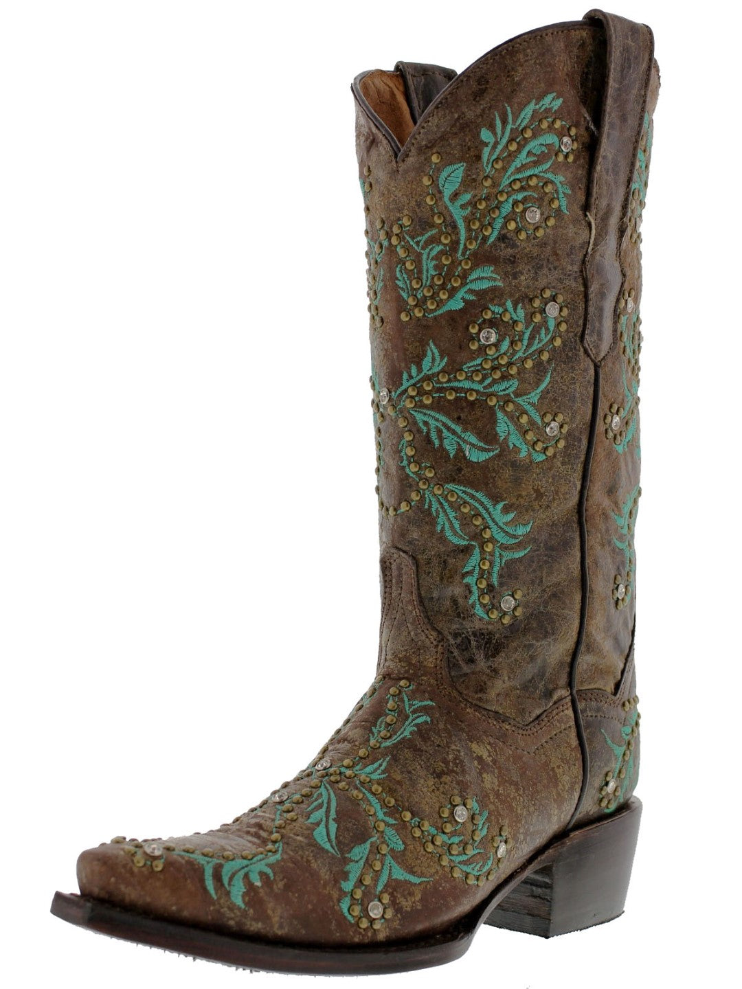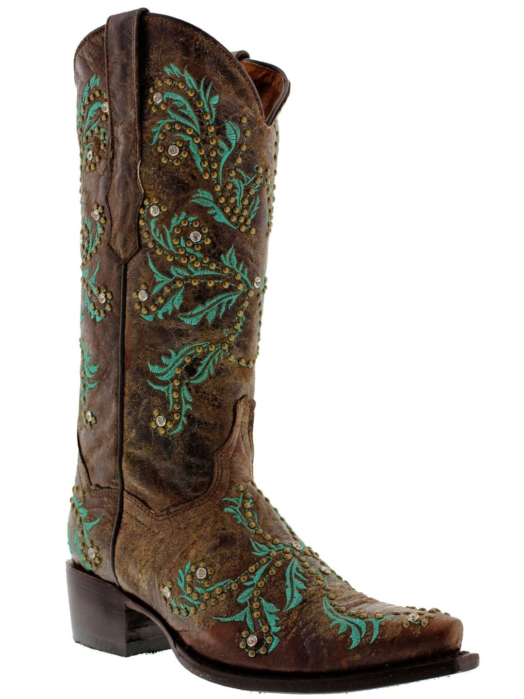 Womens Malaga Brown Leather Cowboy Boots Embroidered - Snip Toe
